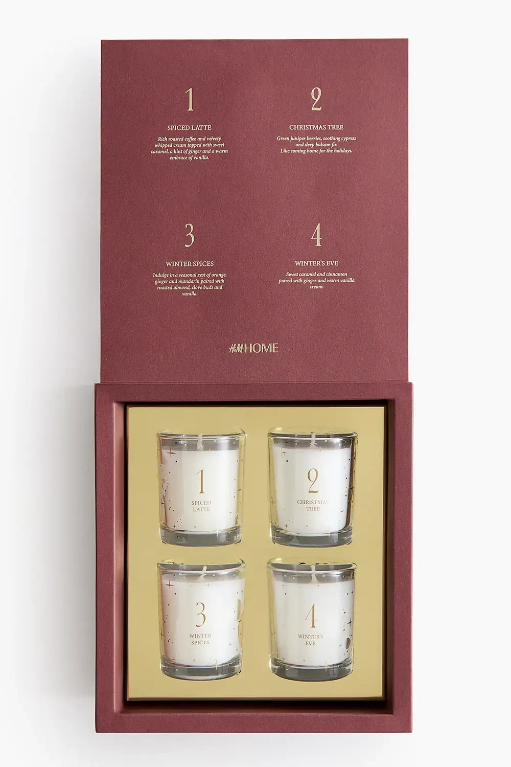 Vier verschillende geurkaarsen met warme wintergeuren, ideaal om een interieur een feestelijke touch te geven. En natuurlijk leuk om te krijgen.