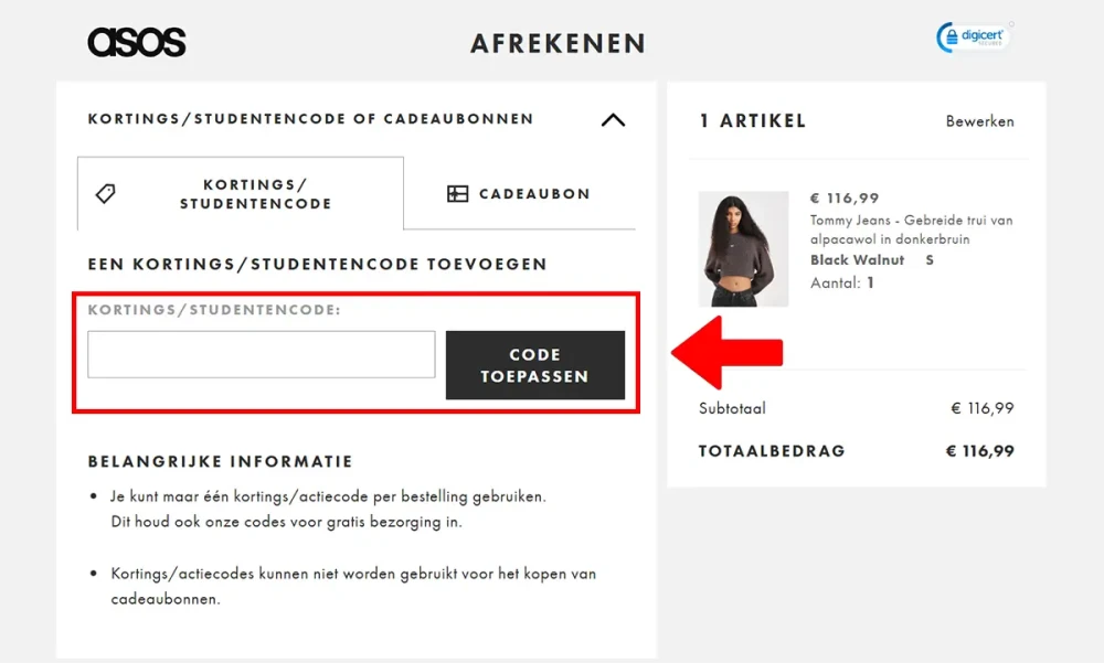 Bij het afrekenen vind je het veld Actie-/studentencode, waar je je ASOS kortingscode exact invoert en vervolgens toepast. Als de korting niet zichtbaar wordt, ligt het vaak aan voorwaarden, merkpartner-items of het type product zoals cadeaubonnen.