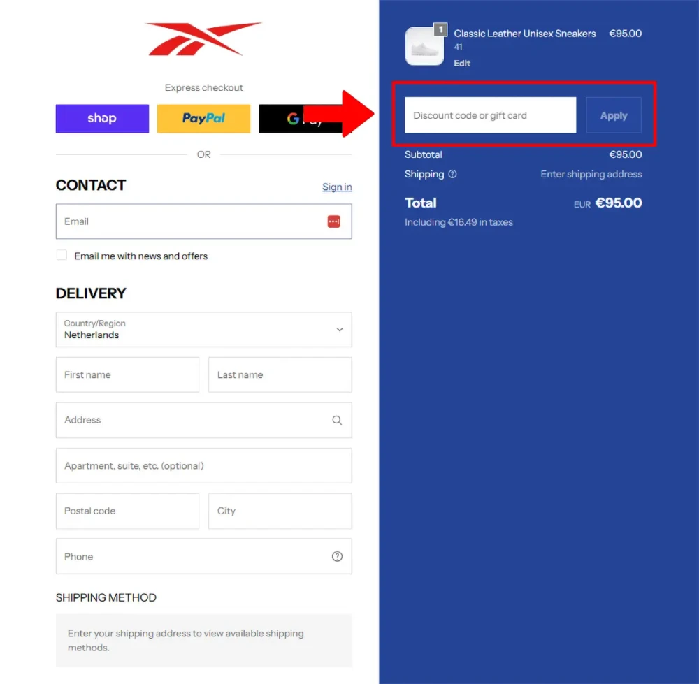Een Reebok kortingscode kan verlopen zijn of alleen geldig zijn op geselecteerde artikelen. Controleer ook of de code niet te combineren is met andere acties en of je de minimale bestelwaarde haalt.