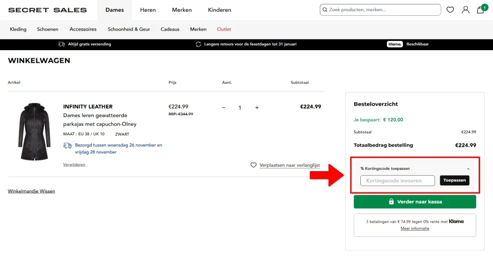 Een kortingscode verzilveren bij Secret Sales is eenvoudig, zolang je weet waar je deze moet invullen. Hieronder zie je precies hoe je jouw korting activeert tijdens het afrekenen.